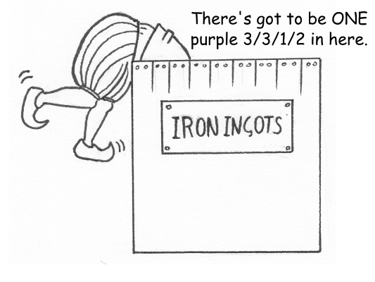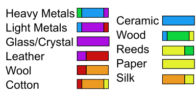 Instead of limiting what materials can be used, we'll put constraints on what materials can be placed next to each other. First, each unit of a material (ingots, textiles, etc) will be unique. You may be carrying a stack of 20 Iron Ingots, but when you look at them individually you'll see that they each have a grain. This will add some complexity to buying and selling materials. The inventory system will need to support a generic and a detailed view. |
