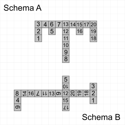 Every tile has a position and orientation in both Schema A and Schema B. The number shows which tiles are the same, and the rotation of the number in Schema B shows the tile has been rotated from its original orientation in Schema A. |